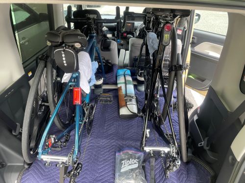軽自動車(ダイハツタント)に大人2人、ロードバイク2台は積むのが大変ですね。前後輪外すのがマスト・・・これだけで時間が倍増 汗 😯